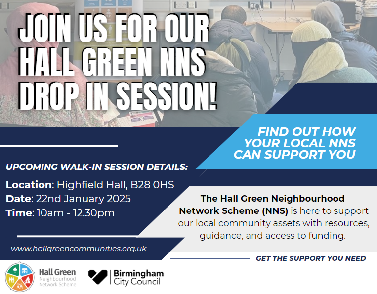 The Hall Green Neighbourhood Network Scheme (NNS) is here to support our local community assets with resources, guidance, and access to funding. Whether you’re an asset in need of support, or simply curious about what we can offer, we invite you to attend one of our upcoming Drop-in sessions!